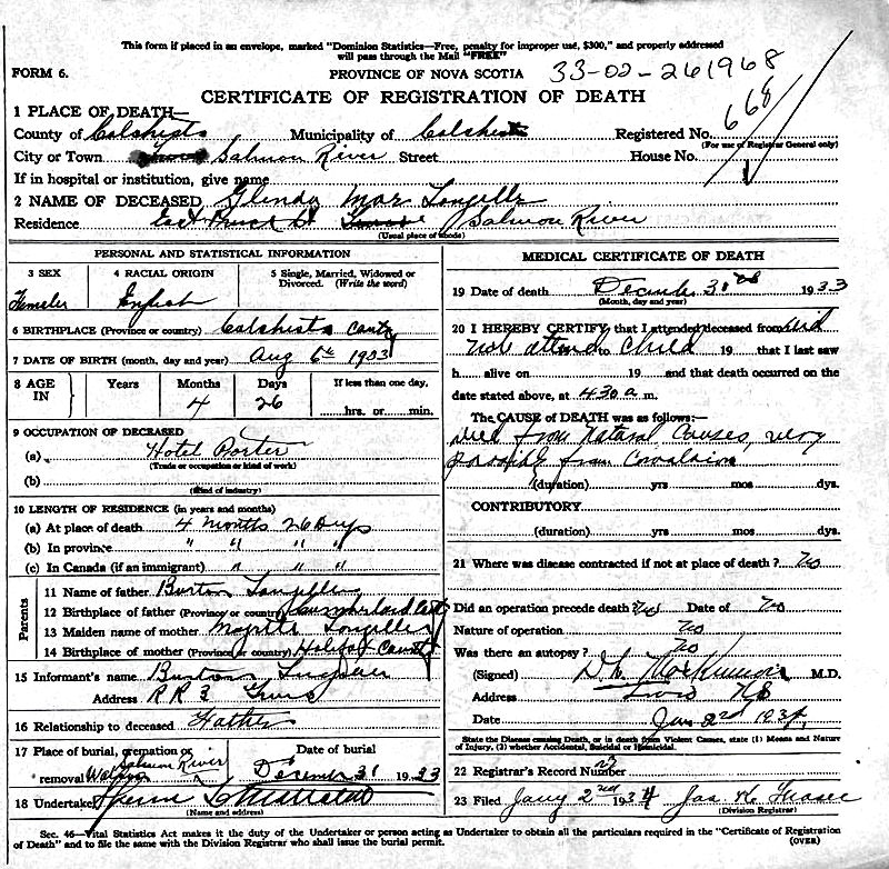 Parents Father: LANGILLE, Burton Elwyn Mother: MURPHY, Myrtle Elena Birth Born on August 06, 1933 in Salmon River, Colchester Co., NS Death Died on December 30, 1933 in Salmon River, Colchester Co., NS Buried in Watson Cemetery in Salmon River, Colchester Co., NS Sources Nova Scotia Deaths: Book 157 Pg. 668 Images Glenda M. Langille Death