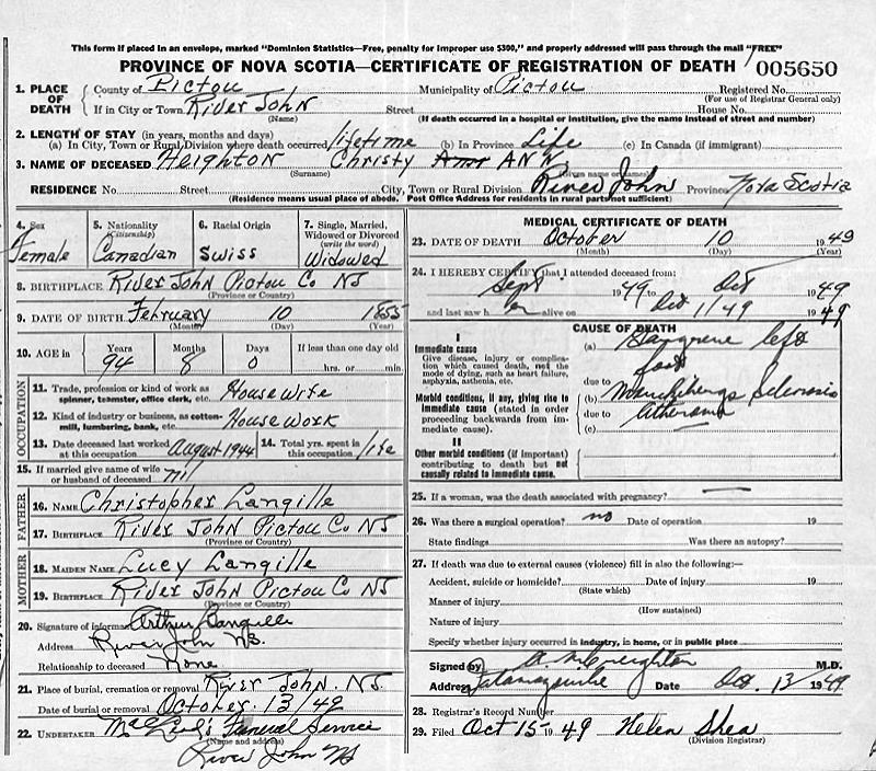 Parents Father: LANGILLE, Christopher Mother: LANGILLE, Lucy Birth Born on February 10, 1855 in River John, Pictou Co., NS Death Died on October 10, 1949 in River John, Pictou Co., NS Buried in Saint John the Baptist Church Cemetery in River John, Pictou Co., NS Marriages HEIGHTON, Alexander MacDonald Married on May 31, 1877 in River John, Pictou Co., NS Children HEIGHTON, Margaret Ann Dwyer: September 02, 1877 - June 17, 1926 Notes Death: Gangrene of Left Foot Sources Nova Scotia Deaths: Year 1949 Pg. 5650 Images Alexander & Christy (Langille) Heighton Christy (Langille) Heighton Death Alexander Heighton Marriage