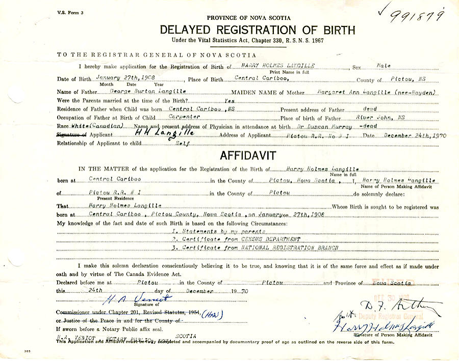 Parents Father: LANGILLE, George Burton Mother: HEIGHTON, Margaret Ann Dwyer Birth Born on January 27, 1908 in Central Caribou, Pictou Co., NS Death Died on September 08, 1990 in Caribou, Pictou Co., NS Marriages PORTER, Marion Annabelle Married on July 24, 1940 in Pictou, Pictou Co., NS Children LANGILLE, Robert LANGILLE, Sally LANGILLE, James Richmond: May 14, 1941 - May 07, 1999 LANGILLE, George Burton: August 09, 1943 - June 07, 2005 Images Harry H. Langille Birth Harry H. Langille Marriage