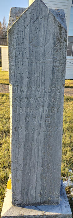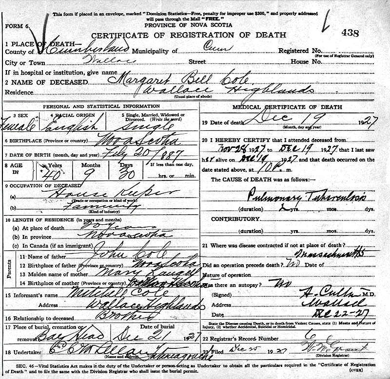 Parents Father: COLE, John Dimock Mother: LANGILLE, Mary Semple Birth Born on February 20, 1887 in Denmark, Colchester Co., NS Death Died on December 19, 1927 in Wallace, Cumberland Co., NS Buried in Union Church Cemetery in Bayhead, Colchester Co., NS Notes Death: Pulmonary Tuberculosis Occupation: Housekeeper Sources Colchester Cemeteries: Bayhead Cemetery #28 Nova Scotia Deaths: Book 120 Pg. 438 Images Margaret Cole Margaret Cole Death
