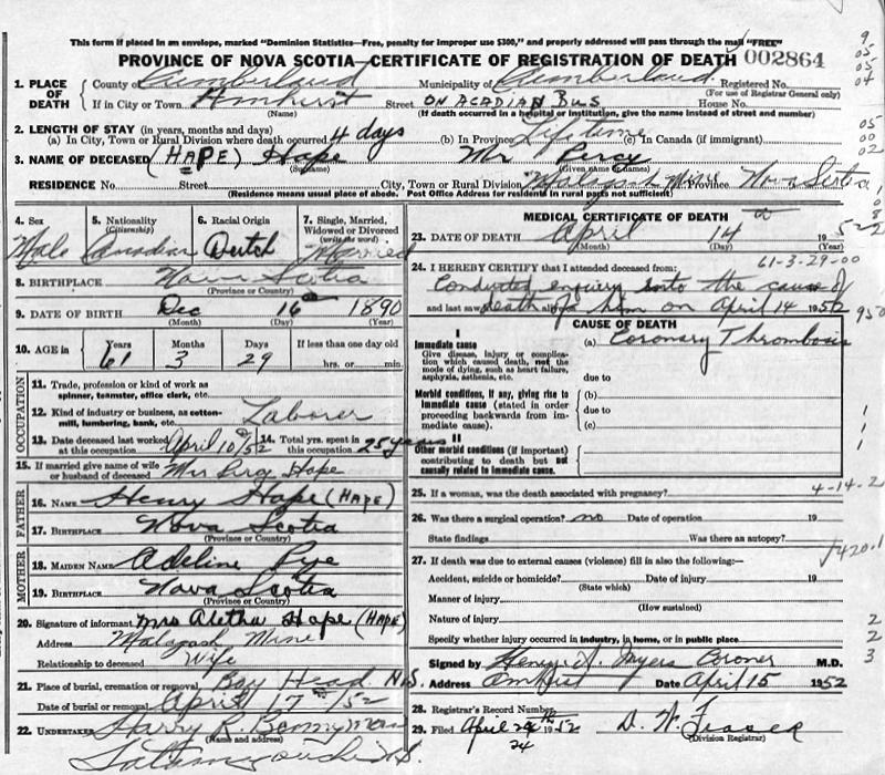 Parents Father: HAPE, John Henry Mother: PYE, Sarah Adeline Birth Born on December 16, 1888 in Marie Joseph, Guysborough Co., NS Death Died on April 14, 1952 in Amherst, Cumberland Co., NS Buried in Union Church Cemetery in Bayhead, Colchester Co., NS Marriages COLE, Euphemia A. Married on April 30, 1919 in Wallace, Cumberland Co., NS Notes Occupation: Farmer Death: Coronary Thrombosis Sources Nova Scotia Deaths: Year 1952 Pg. 2864 Images Percy Hape Death Euphemia Cole Marriage
