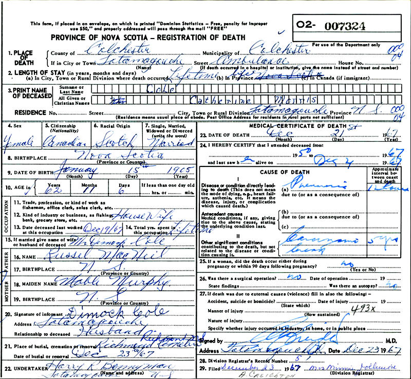 Birth Born on January 15, 1905 in Wallace, Cumberland Co., NS Death Died on December 21, 1967 in Tatamagouche, Colchester Co., NS Buried in Monument Hill Cemetery in Wallace Grant, Cumberland Co., NS Marriages COLE, Dimock Torry Married on June 15, 1921 in Pugwash, Cumberland Co., NS Children COLE, Lorne Dimock: November 29, 1921 - June 15, 2009 COLE, Katherine Roberta: February 28, 1923 - August 14, 1953 COLE, Roy Carl: 1925 - October 02, 1993 COLE, Florence Annetta: 1926 - 2007 COLE, Marie Jean: November 23, 1927 - May 03, 2018 COLE, Hazel Mabel: 1929 - August 31, 2015 COLE, Cecilia Mary: 1931 - 2012 COLE, Lula Irene: May 30, 1933 - November 28, 1933 COLE, Morris Culton: 1936 - April 10, 2005 Notes Death: Pneumonia Sources Nova Scotia Deaths: Year 1967 #7324 Images Dimock & Catherine (McNeil) Cole,Katherine & Lula Cole Katherine (McNeil) Cole Death Dimock Cole Marriage