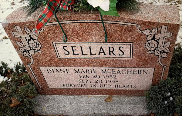 Parents Father: McEACHERN, Alphonsus John Mother: LANGILLE, Laura Ella Birth Born on February 20, 1952 in Pugwash, Cumberland Co., NS Death Died on September 20, 1998 in Kentville, Kings Co., NS Buried in Elm Grove Cemetery in Steam Mill, Kings Co., NS Marriages SELLARS, Unknown Sources Kings Cemetery Records: Elm Grove Cemetery Steam Mill,NS Images Diane (McEachern) Sellars