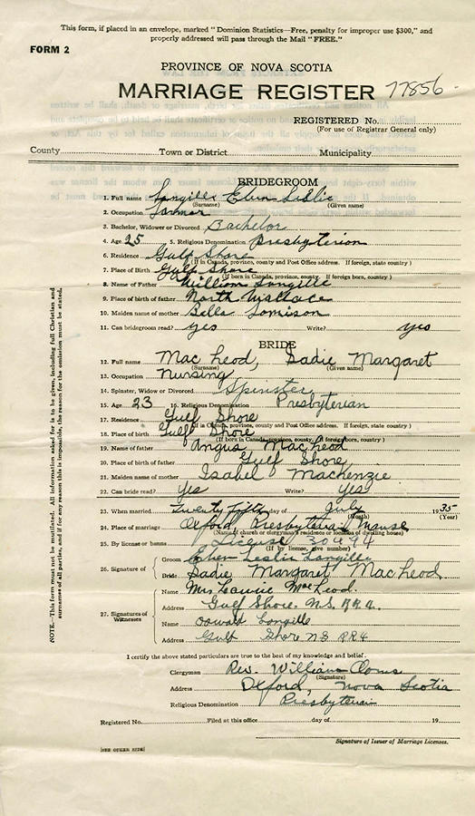 Parents Father: LANGILLE, James William Mother: JAMIESON, Catherine Isabelle Mae Birth Born on May 26, 1910 in Gulf Shore, Cumberland Co., NS Death Died on September 24, 2006 in Cole Harbour, Halifax Co., NS Buried in Waugh Cemetery in Gulf Shore, Cumberland Co., NS Marriages MACLEOD, Sadie Margaret Married on July 25, 1935 in Oxford, Cumberland Co., NS Children LANGILLE, James Notes Obituary: Halifax Chronicle Herald Occupation: Farmer/ Nursing Assistant Sources Halifax Herald: Obituary Images Eben Langille Birth Eben & Sadie (MacLeod) Langille Eben Langille Marriage