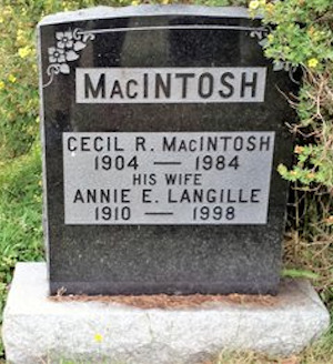 Parents Father: MACINTOSH, James Mother: ROSS, Jessie Ellen Birth Born on August 13, 1904 in Wallace Ridge, Cumberland Co., NS Death Died on 1984 in Cumberland Co., NS Buried in Palmerston Cemetery in Pugwash, Cumberland Co., NS Marriages LANGILLE, Anne Estella Children MACINTOSH, Beverly Sources Cumberland Cemetery Records: Palmerston Cemetery Pugwash,NS Images Cecil & Anne (Langille) MacIntosh