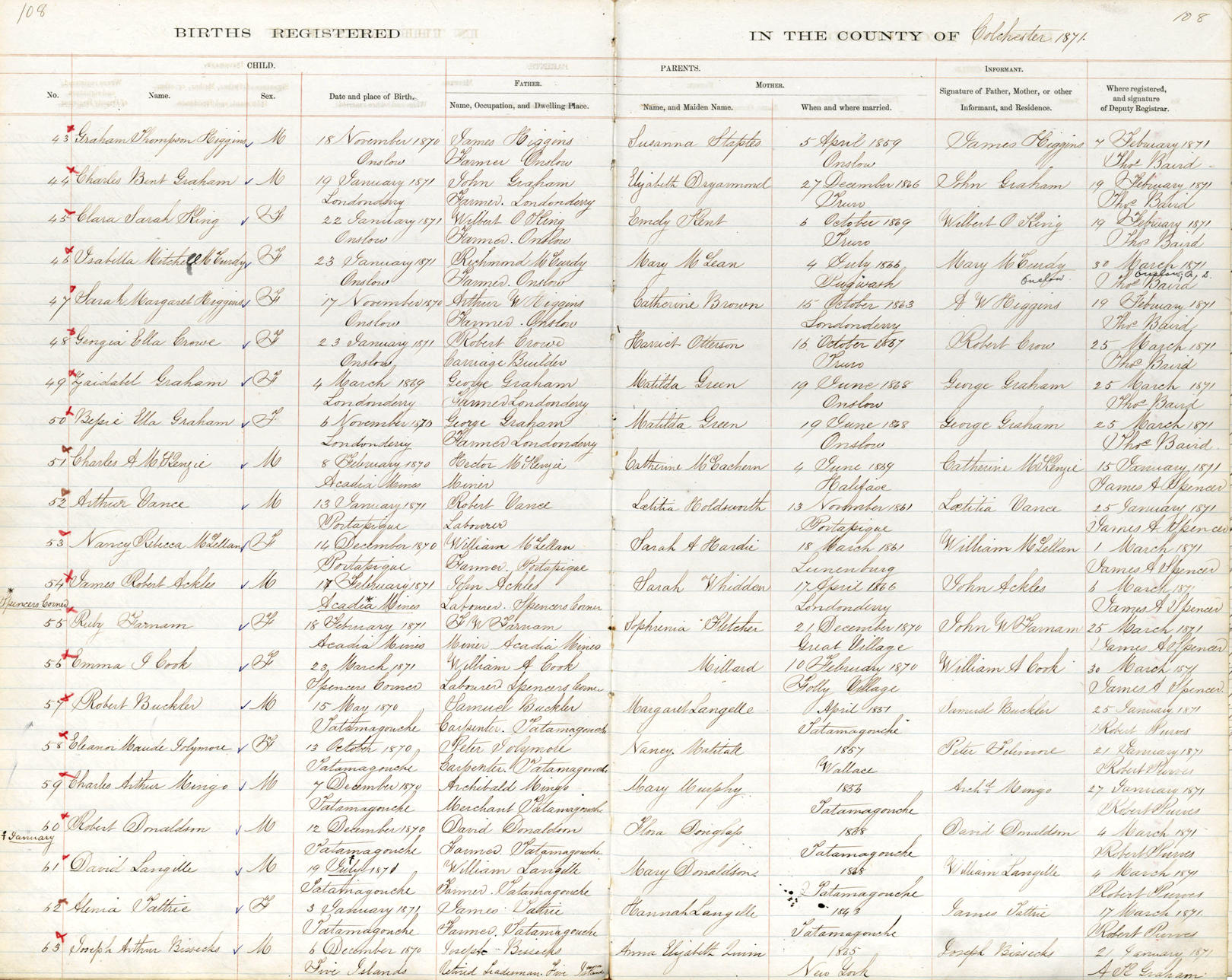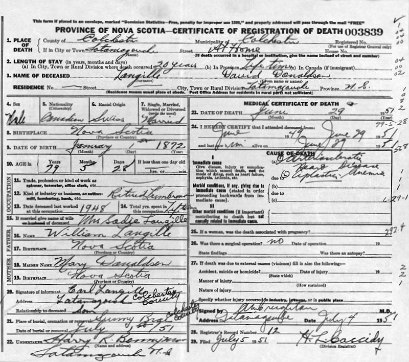 Parents Father: LANGILLE, William Mother: DONALDSON, Mary June Birth Born on July 19, 1871 in Tatamagouche, Colchester Co., NS Death Died on June 29, 1951 in Tatamagouche, Colchester Co., NS Buried in Sunny Brae Cemetery in French River, Colchester Co., NS Marriages LANGILLE, Sarah May Married on September 14, 1898 in Tatamagouche, Colchester Co., NS Children LANGILLE, Agnes: January 26, 1900 - March 02, 1969 LANGILLE, Beatrice Mae: August 16, 1902 - 1990 LANGILLE, Earl: May 08, 1905 - October 04, 1985 LANGILLE, Leslie David: June 01, 1907 - November 03, 1954 LANGILLE, Susan Viola: February 04, 1912 - March 27, 2000 Notes Occupation: Farmer/ Lumberman Death: Arterioscleratic Heart Disease Obituary: Tatamagouche, July 2 - Many friends through out the Province and U.S.A. were shocked to learn of the sudden death of the late David D. LANGILLE which occurred on Friday night, June 29. Although he had been in failing health for the past two years his passing away came as a shock to his family and friends. Deceased was a son of the late William and Mary LANGILLE, and was born January 1, 1872, at French River. For a number of years he resided on a farm at Millbrook but for the past 23 years had resided in Tatamagouche. Besides farming, he was a prominent lumberman for a number of years. Besides his wife, Mrs. Sarah LANGILLE, he leaves to mourn, three daughters, Agnes, (Mrs. L.G. ANNIS), Susan, (Mrs. A.G. MacBURNIE), Tatamagouche, Beatrice, (Mrs. Ben ROBERTS), Debert, two sons, Earl and Leslie, both of Tatamagouche, two sisters, Cecilia, (Mrs. John AITCHESON), Millbrook, Bertha, (Mrs. James VINCENT), Inverness, Montana, three brothers George and Ellsworth of Tatamagouche and Wilburt of Concord, Mass., also six grandchildren. His brothers, Boyd, predeceased him 20 years ago, Ben, 10 years ago, James, 2 years ago, and a sister Mary, (Mrs. James MacLELLAN) 3 years ago. The funeral service was held at the residence on Sunday afternoon, Jul 1 and was conducted by Rev. G.W. BRUCE, assisted by Rev. G.E. WHIDDEN. Favorite Hymns including "The Lord's My Shepherd" and the "Church's one Foundation" were sung and his nephew, Roland LANGILLE sang very beautifully, "Shadows," as a solo. The pallbearers were nephews of the deceased George and Wilburt AITCHESON and Fred A. GEORGE and Wilburt AITCHESON and Fred A. LANGILLE, Millbrook, Dr. James LANGILLE, Amherst and Cecil and Hector LANGILLE of Tatamagouche. Interment was in the Sunny Brae Cemetery. Sources Nova Scotia Deaths: Year 1951 Pg. 3839 Images David D. Langille Birth David D. & Sarah M. (Langille) Langille David D. Langille Death Sarah M. Langille Marriage