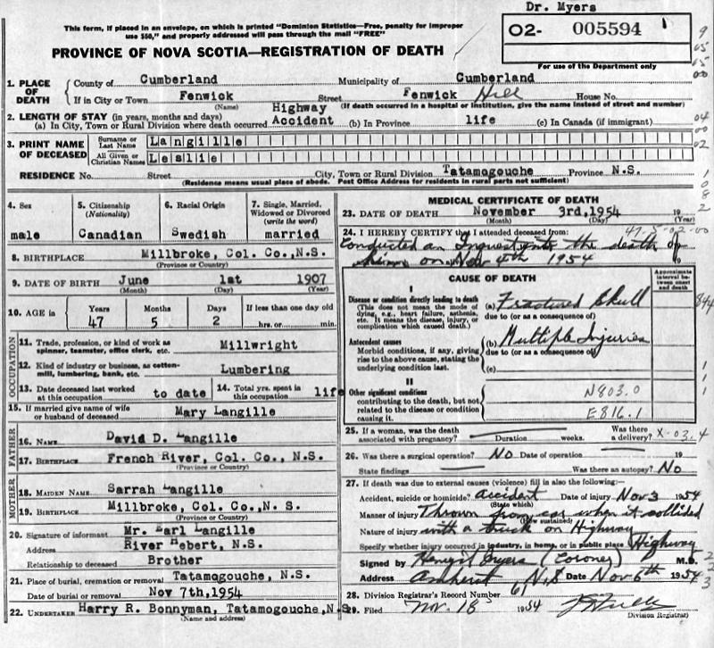 Parents Father: LANGILLE, David Donaldson Mother: LANGILLE, Sarah May Birth Born on June 01, 1907 in Millbrook, Colchester Co., NS Death Died on November 03, 1954 in Fenwick, Cumberland Co., NS Buried in Lockerby Memorial Cemetey in Tatamagouche, Colchester Co., NS Marriages DOBSON, Mary Emma Married on March 11, 1931 in Truro, Colchester Co., NS Children LANGILLE, Leslie Carson: January 22, 1935 - February 05, 1976 LANGILLE, R. Clayton: 1938 - January 03, 2024 Notes Occupation: Millwright Death: Automobile Accident - Fractured Skull/ Multiple Injuries - Thrown From Car Sources Nova Scotia Deaths: Year 1954 Pg. 5594 Colchester Cemeteries: Tatamagouche Lockerby Memorial Cemetey Images Leslie D. & Mary (Dobson) Langille Leslie Langille Death Leslie D. Langille Marriage