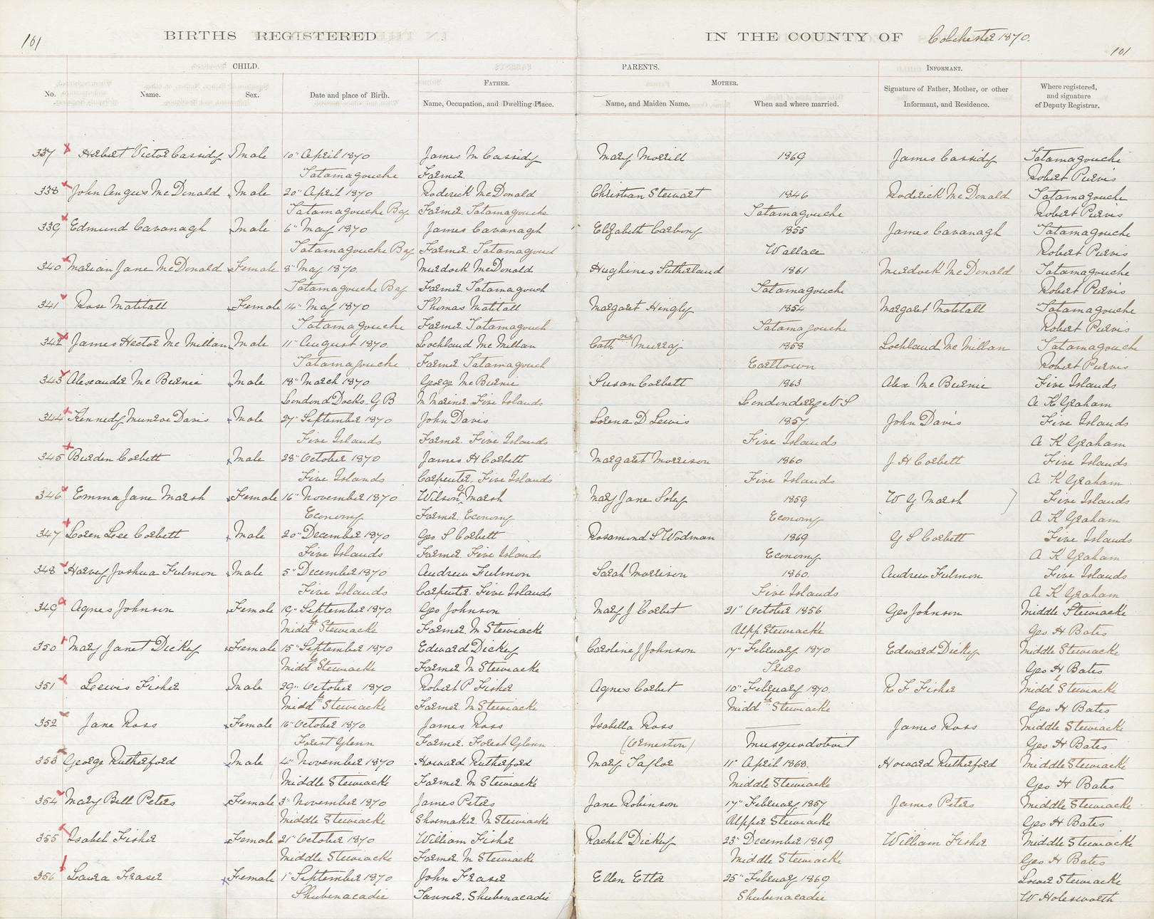 Birth Born on April 10, 1870 in Tatamagouche, Colchester Co., NS Death Died on April 13, 1950 in Tatamagouche, Colchester Co., NS Buried in Sharon United Cemetery in Tatamagouche, Colchester Co., NS Marriages BARNES, Alice Lawrence Married on October 24, 1893 in Malden, Middlesex Co., MA Children CASSIDY, Alice Maud: October 17, 1903 - April 18, 1998 Notes Occupation: Tailor/ Merchant Death: Hemiplegia Sources Nova Scotia Deaths: Year 1950 Pg. 2591 Colchester Cemeteries: Tatamagouche Sharon United Cemetery #140 Images Herbert Cassidy Birth Herbert & Alice (Barnes) Cassidy Herbert Cassidy Death Herbert Cassidy Marriage