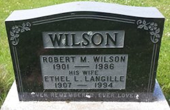 Parents Father: LANGILLE, George Mother: LANGILLE, Susan Birth Born on June 30, 1907 in Tatamagouche, Colchester Co., NS Death Died on 1994 in Middleton, Colchester Co., NS Buried in Lockerby Memorial Cemetey in Tatamagouche, Colchester Co., NS Marriages WILSON, Robert McIver Married on March 07, 1934 in Truro, Colchester Co., NS Children WILSON, John WILSON, Robert WILSON, Gerald David: April 20, 1937 - March 22, 2013 Notes Occupation: Teacher Sources Colchester Cemeteries: Lockerby Memorial Cemetery Tatamagouche,NS Images Robert & Ethel (Langille) Wilson