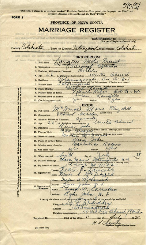 Parents Father: LANGILLE, George Mother: LANGILLE, Susan Birth Born on February 27, 1912 in Tatamagouche, Colchester Co., NS Death Died on 1990 in Truro, Colchester Co., NS Buried in Lockerby Memorial Cemetery in Tatamagouche, Colchester Co., NS Marriages MACDONALD, Marie Elizabeth Married on July 06, 1938 in Tatamagouche, Colchester Co., NS Children LANGILLE, George Gordon: 1940 - December 29, 2003 LANGILLE, Carolyn Marie: December 30, 1944 LANGILLE, Brenda Joan: July 30, 1953 Notes Occupation: Telegraph Operator/ Partner in Langille Bros. Automobile Dealership Sources Colchester Cemeteries: Lockerby Memorial Cemetery Tatamagouche,NS Images Hector Langille Birth Hector & Marie (MacDonald) Langille Hector Langille Marriage