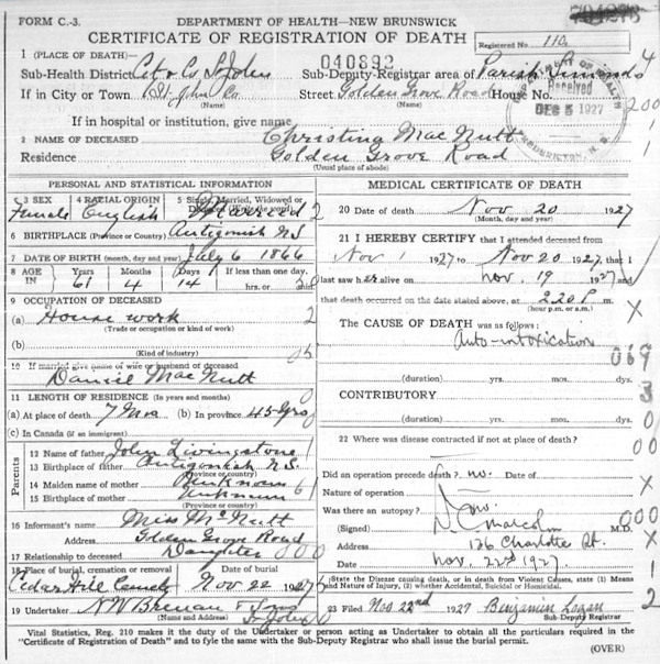 Birth Born on July 06, 1865 in Cape George, Antigonish Co., NS Death Died on November 20, 1927 in Saint John Co., NB Buried in Cedar Hill Cemetery in Saint John, Saint John Co., NB Marriages MACNUTT, Daniel P. Married on July 30, 1891 in Antigonish, Antigonish Co., NS Children MACNUTT, Elsie Myrtle: May 05, 1892 - January 16, 1959 Notes Death: Auto Intoxication Sources NB Deaths: #40892 Images Christina (Livingstone) MacNutt Death Daniel MacNutt Marriage