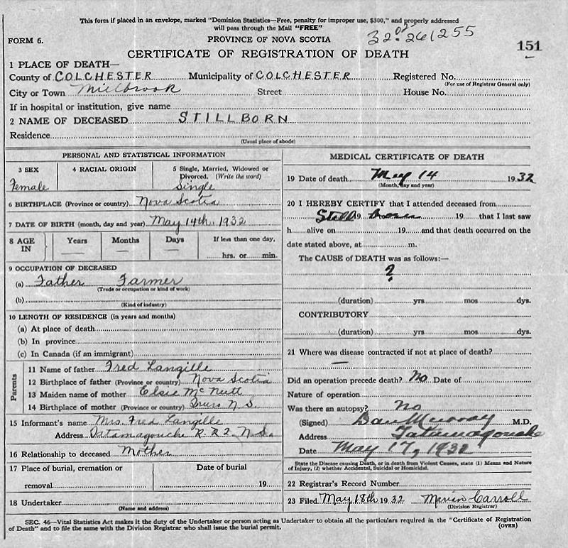 Parents Father: LANGILLE, Frederick Allison Mother: MACNUTT, Elsie Myrtle Birth Born on May 14, 1932 in Millbrook, Colchester Co., NS Death Died on May 14, 1932 in Millbrook, Colchester Co., NS Notes Death: Stillborn Sources Nova Scotia Deaths: Book 157 Pg. 151 Images Girl Langille Death