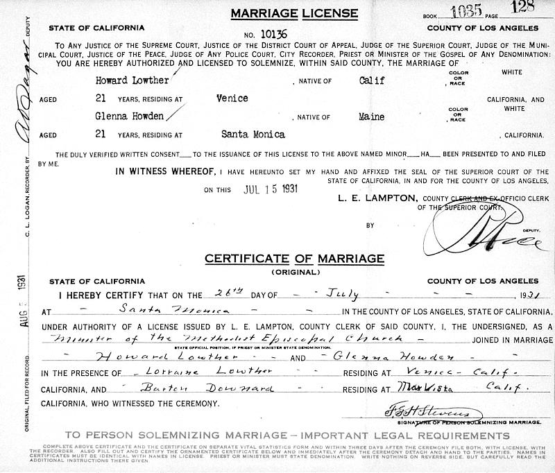 Parents Father: HOWDEN, Arthur Duncan Mother: FOWLER, Mary Edna Birth Born on May 18, 1910 in Presque Isle, Aroostook Co., ME Marriages LOWTHER, Howard Bennington Married on July 26, 1931 in Santa Monica, Los Angeles Co., CA Divorced in 1953 Children LOWTHER, Ronald Bennington: August 17, 1932 - March 11, 2020 LOWTHER, Linda Gay: February 19, 1937 Notes Occupation: Stenographer Images Glenna Howden Marriage