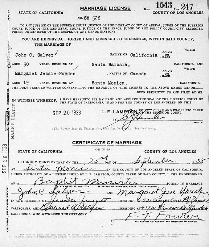Birth Born on March 20, 1908 in San Luis Obispo Co., CA Death Died on March 26, 1984 in Orange Co., CA Marriages HOWDEN, Margaret Jessie Married on September 23, 1938 in Santa Monica, Los Angeles Co., CA Notes Occupation: Teacher/ Ptrincipal Military Service: WW2 US Army Images John Salyer WW2 Draft Margaret Howden Marriage