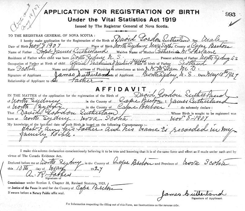 Parents Father: SUTHERLAND, James Mother: McFARLANE, Catherine A. Birth Born on November 08, 1907 in North Sydney, Cape Breton Co., NS Marriages JAMIESON, Jessie Bell Married on November 07, 1928 in Halifax, Halifax Regional Municipality, NS Children SUTHERLAND, Charles SUTHERLAND, Bruce Notes Occupation: Electrician/ Truck Driver Images David Sutherland Birth Jessie Jamieson Marriage