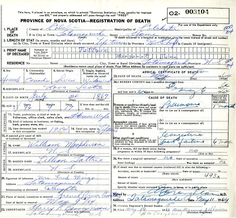 Birth Born on July 20, 1867 in Tatamagouche, Colchester Co., NS Death Died on May 07, 1964 in Tatamagouche, Colchester Co., NS Buried in French River Cemetery in French River, Colchester Co., NS Marriages TATTRIE, James William Married on January 26, 1894 in Tatamagouche, Colchester Co., NS Children TATTRIE, Margaret Clark: March 30, 1902 - January 06, 2001 Notes Death: Pneumonia/ Congestive Heart Failure Sources Nova Scotia Deaths: Year 1964 Pg. 3104 Images Abraham & Mary (Cole) & James W. & Margaret (MacPherson) Tattrie Margaret (MacPherson) Tattrie Death James Tattrie Marriage