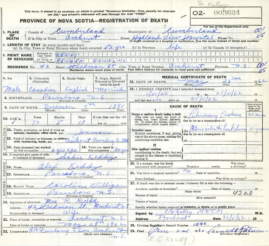Parents Father: KEDDY, Alexander Mother: WILLIGAR, Caroline Adelaide Birth Born on December 07, 1891 in Parrsboro, Cumberland Co., NS Death Died on May 25, 1962 in Amherst, Cumberland Co., NS Buried in Amherst Cemetery in Amherst, Cumberland Co., NS Marriages CHAMBERS, Sadie Valetta Married on November 06, 1912 in Amherst, Cumberland Co., NS Children KEDDY, Ronald KEDDY, Margaret KEDDY, Ray Victor: July 24, 1913 - April 25, 2006 KEDDY, Reginald Stanley: April 19, 1921 - July 01, 1936 KEDDY, Jean Audrey: 1925 - April 09, 2015 KEDDY, Carol: December 10, 1931 - December 10, 1931 Notes Occupation: Carpenter/ Foreman at Amherst Foundry Co. Death: Pulmonary Edema Sources Nova Scotia Deaths: Year 1962 Pg. 3624 Images Reuben & Sadie (Chambers) & Reginald,Carol Keddy Reuben Keddy Death Sadie Chambers Marriage