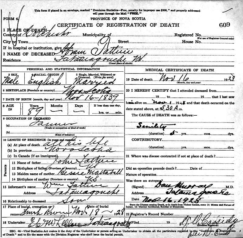 Parents Father: TATTRIE, John Mother: MATTATALL, Mary Margaret Birth Born on February 25, 1838 in Tatamagouche, Colchester Co., NS Death Died on November 16, 1928 in Tatamagouche, Colchester Co., NS Buried in French River Cemetery in French River, Colchester Co., NS Marriages COLE, Mary Married on August 16, 1869 in Tatamagouche, Colchester Co., NS Children TATTRIE, James William: June 14, 1870 - January 16, 1961 TATTRIE, Washington Erving: May 30, 1877 - April 09, 1966 TATTRIE, Frances Jane: July 03, 1880 - August 12, 1970 Notes Occupation: Farmer Death: Senility Sources Nova Scotia Deaths: Year 1928 File 119 #609 Images Abraham & Mary (Cole) & James W. & Margaret (MacPherson) Tattrie Abraham & Mary (Cole) Tattrie & James W. & Margaret (MacPherson) Tattrie Abraham Tattrie Death Abraham Tattrie Marriage