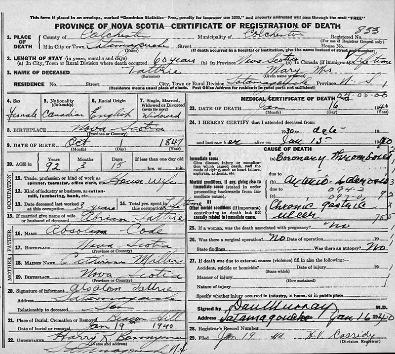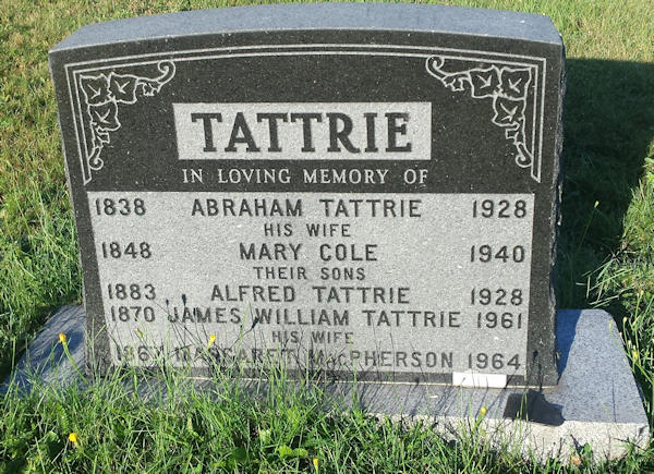 Birth Born on October 01, 1847 in Tatamagouche, Colchester Co., NS Death Died on January 16, 1940 in Tatamagouche, Colchester Co., NS Buried in French River Cemetery in French River, Colchester Co., NS Marriages TATTRIE, Abraham Married on August 16, 1869 in Tatamagouche, Colchester Co., NS Children TATTRIE, James William: June 14, 1870 - January 16, 1961 TATTRIE, Washington Erving: May 30, 1877 - April 09, 1966 TATTRIE, Frances Jane: July 03, 1880 - August 12, 1970 Notes Death: Coronary Thrombosis Sources Nova Scotia Deaths: Book 170 Pg. 833 Images Abraham & Mary (Cole) & James W. & Margaret (MacPherson) Tattrie Abraham & Mary (Cole) Tattrie & James W. & Margaret (MacPherson) Tattrie Mary (Cole) Tattrie Death Abraham Tattrie Marriage