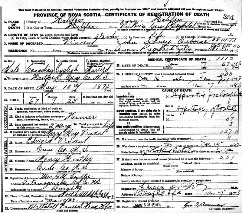 Birth Born on May 13, 1876 in Hartford, Cumberland Co., NS Death Died on January 07, 1943 in Halifax, Halifax Regional Municipality, NS Buried in Riverside Cemetery in Wallace River, Cumberland Co., NS Marriages MOORING, Mercy Mae Married on May 02, 1906 in Lower Greenville, Cumberland Co., NS Children VINCENT, Lucille Rae: June 16, 1909 - March 06, 1960 VINCENT, Violet Evelyn: October 19, 1920 - November 17, 2000 Notes Occupation: Farmer Death: Suppurative of Frelor of Artery/ Hypertrophy of Prostate Sources Nova Scotia Deaths: Book 210 Pg. 351 Images John & Mercy (Mooring) Vincent John Vincent Death John Vincent Marriage