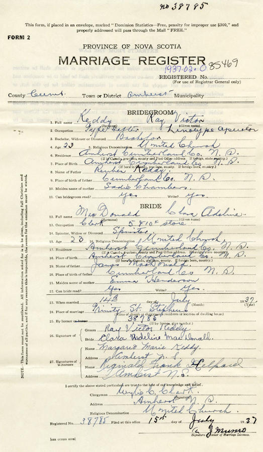 Parents Father: KEDDY, Reuben Douglas Mother: CHAMBERS, Sadie Valetta Birth Born on July 24, 1913 in Amherst, Cumberland Co., NS Death Died on April 25, 2006 in Bristol, Hartford Co., CT Buried in Peacedale Cemetery in Bristol, Hartford Co., CT Marriages MACDONALD, Clara Adeline Married on July 14, 1937 in Amherst, Cumberland Co., NS Children KEDDY, Ronald Edward: May 12, 1939 - February 17, 2011 KEDDY, Lorna J.: March 24, 1943 KEDDY, Roy Victor: October 21, 1945 KEDDY, Sandra G.: September 01, 1948 KEDDY, Kenneth E.: 1957 - April 14, 1990 Notes Occupation: Linotype Operator Images Ray Keddy Birth Ray Keddy Marriage
