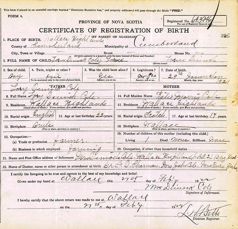 Parents Father: COLE, Dimock Torry Mother: McNEIL, Katherine Morris Birth Born on November 29, 1921 in Wallace Highlands, Cumberland Co., NS Death Died on June 15, 2009 in Truro, Colchester Co., NS Buried in Lockerby Memorial Cemetery in Tatamagouche, Colchester Co., NS Marriages CANTON, Pauline Clara Married on September 11, 1948 in Amherst, Cumberland Co., NS Children COLE, Loreen Paulette COLE, Frederick COLE, Kim Notes Occupation: Truckman/ Owner Cole's Transfer Ltd. Obituary: Cole, Lorne D. - 87, Truro Heights passed away peacefully June 15, 2009 in Colchester Regional Hospital, Truro. Born in Richmond, Cumberland County on November 29, 1921, he was a son of the late Dimock and Kate (MacNeil) Cole. Lorne started working in the woods in his early teens before he worked in the trucking business. He purchased a small business and built it into Cole's Transfer Limited, a major employer in Tatamagouche during the 1960's, later relocating to North River. His business expanded over mainland Nova Scotia and New Brunswick where he operated it until it was sold to Speedway Transport in the early seventies. Lorne was a member of Sharon United Church, Tatamagouche and served as a volunteer member of the Tatamagouche Fire Department and a founding member of the North River Fire Brigade. He was a Nova Scotia Hunting Guide for over 50 years developing lifelong friendships with his American friends. He spent his leisure time fishing in Nova Scotia and taking legendary fishing trips to Newfoundland. Lorne is survived by his wife of 60 years, Pauline (Canton) Cole; children, Loreen (George W.) MacNutt, Truro Heights, Fred (Richard Corteel), Truro, Kim (Lynn MacKinnon), Bible Hill; grandchildren, Peter MacNutt (Kim), Cambridge, Ont., Patti Barkhouse (Doug), Lower Onslow, Danny MacNutt (Becky), Onslow Mountain, Justin and Jeremy Cole, Bible Hill; great-grandchildren, Kayla and Jenna MacNutt, Morgan and Cole Barkhouse, Nathaniel MacNutt; sisters, Marie Sinclair (Edgar), Goshen, Hazel Miller, Bible Hill, Cecilia Graham, Hamilton, Ont.; several nieces and nephews. He was predeceased by sisters, Lula, Katherine and Florence; brothers, Roy and Morris. Cremation has taken place. A Memorial Service will take place on Saturday, June 20th at 1:00 pm in Colchester Community Funeral Home, 512 Willow Street, Truro. Reception to follow the service. A private family interment will take place in Lockerby Cemetery, Tatamagouche. Family flowers only. Donations in Lorne's memory may be made to the North River Fire Brigade or a charity of choice. On-line condolences may be made at www.colchestercommunity.com Sources Funeral Home: Colchester Community Funeral Home Truro,NS Obituary June 2009 Images Lorne Cole Birth Lorne & Pauline (Canton) Cole Lorne Cole Marriage Lorne Cole