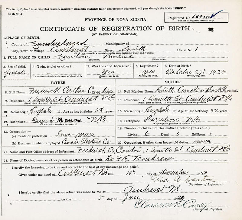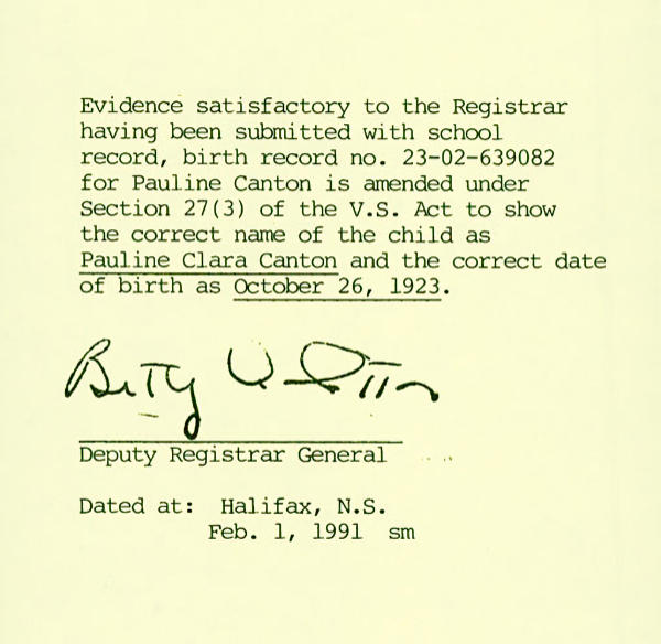 Birth Born on October 26, 1923 in Amherst, Cumberland Co., NS Death Died on May 19, 2012 in Truro, Colchester Co., NS Buried in Monument Hill Cemetery in Tatamagouche, Colchester Co., NS Marriages COLE, Lorne Dimock Married on September 11, 1948 in Amherst, Cumberland Co., NS Children COLE, Loreen Paulette COLE, Frederick COLE, Kim Notes Occupation: Stenographer Obituary: Cole, Pauline Clara - 88, of Truro passed away peacefully May 19, 2012 in her home at Cedarstone Enhanced Care in Truro. Born in Amherst, Cumberland County, long-time resident of Tatamagouche and North River, she was the daughter of the late Frederick Arthur and Edith Amelia (Barkhouse) Canton. Prior to her marriage to husband Lorne she resided in Amherst where she received her education and was a graduate of St. Charles Business College. She was a member of Christ Church (Anglican) and became an active member of Sharon United Church, Tatamagouche, after her marriage. During her early married life, she resided in Tatamagouche, where she raised a family and worked with her husband, Lorne, operating Cole's Transfer. She moved to North River in the early 1970s with her family. She dedicated her life to her husband and family. Pauline is survived by her children Loreen (George W.) MacNutt, Truro Heights; Fred (Richard Corteel), Malagash; Kim (Lynn MacKinnon), Bible Hill; sisters Phyllis Powell, Montreal; Faye Glenen (Ralph), Stellarton; her brothers Fred Canton (Joyce), Truro; Douglas (Gerrie), Burnaby, B.C.; Donald Canton (Phyllis), Amherst; Kenneth Canton (Judy), Amherst; sister-in-law Gertie Canton, Amherst, several nieces and nephews; grandchildren Peter MacNutt (Kim), Valley; Patti Barkhouse (Doug), Lower Onslow; Danny MacNutt (Becky), Onslow Mountain; Justin and Jeremy Cole, Bible Hill; great-grandchildren Kayla and Jenna MacNutt, Morgan and Cole Barkhouse and Nathaniel MacNutt. Grammie was looking forward to the birth of her next great-grandchild (Danny & Becky) due in August. She will be the guardian angel watching over her grandchildren. Pauline was predeceased by her husband Lorne, sister Francis and brothers Gordon, George, Bert and William. Cremation has taken place. A Memorial Service will take place on Thursday, May 24th at 2 pm in Colchester Community Funeral Home, 512 Willow Street, Truro with Rev. Morley Bentley officiating. A private family interment will take place in Lockerby Cemetery, in Tatamagouche. Family flowers only. Donations in Pauline's memory can be made to the charity of your choice. Live web-casting of the service will begin at 1:58 pm (Atlantic Time) on Thursday, and is available along with on-line condolences and donations at: www.colchestercommunity.com Sources Funeral Home: Colchester Community Funeral Home Truro,NS Obituary May 2012 Images Pauline Canton Birth1 Pauline Canton Birth Lorne & Pauline (Canton) Cole Lorne Cole Marriage Pauline Canton