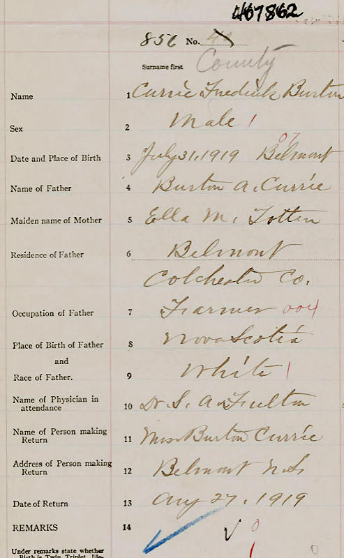 Birth Born on July 31, 1919 in Belmont, Colchester Co., NS Death Died on August 03, 1995 in Truro, Colchester Co., NS Buried in Clark Cemetery in Onslow, Colchester Co., NS Marriages ARMSWORTHY, Jean Thelma Children CURRIE, Cheryl Diane: November 03, 1958 Notes Occupation: Electrician Images Frederick Currie Birth