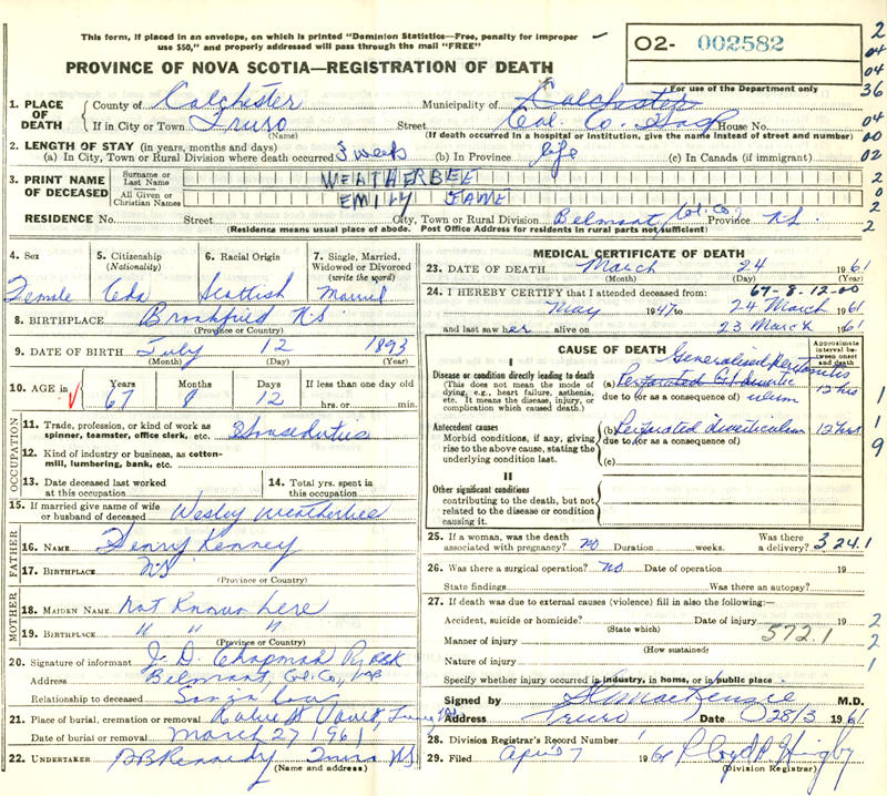 Birth Born on July 12, 1893 in Brookfield, Colchester Co., NS Death Died on March 24, 1961 in Truro, Colchester Co., NS Buried in Robie St. Cemetery in Truro, Colchester Co., NS Marriages WEATHERBEE, Wesley Albert Married on March 25, 1944 in Truro, Colchester Co., NS Notes Death: Generalized Peritonitis/ Perforated Diverticulum Sources Nova Scotia Deaths: Year 1961 #2582 Images Emily (Whippie) Weatherbee Death Wesley Weatherbee Marriage