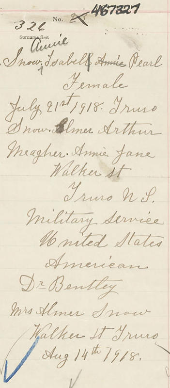 Birth Born on July 21, 1918 in Truro, Colchester Co., NS Death Died on March 31, 2007 in Truro, Colchester Co., NS Buried in Watson Cemetery in Salmon River, Colchester Co., NS Marriages GILBY, James Reginald Married on November 06, 1937 in Truro, Colchester Co., NS Children GILBY, Reginald Lee: September 20, 1939 - July 29, 2002 Notes Occupation: Factory Worker Obituary: GILBY: Pearl Annie Isobel, 88, of Prince Street, Truro, passed away peacefully, Saturday, March 31, 2007, surrounded by her loving family after a brief illness, in the Colchester Regional Hospital Truro. Born in Truro, July 21, 1918, she was the daughter of the late Elmer and Annie (Mahar) Snow. She was predeceased by her husband, James Reginald; sons, Lee and Ross; daughter, North Taggart; sisters, Lillian McMillan (Gordon), Jean Reid (Harold), Hope Toole (Ross); daughter-in-law, Marie Gilby. She is survived by her son, Boyd (Simonne), Moncton; daughters, Laverne Watt, Debert; Janet Nelson (Lloyd), Bible Hill; Joyce Spencer (Wayne), Great Village; nine grandchildren and eight great-grandchildren. Pearl was a life long member of the Eastern Star Lodge, Myrtle Chapter 21and an adherent of the Immanuel Baptist Church, Truro. Her passions were her love of card games, auctions, yard sales, and most of all her family. She will be greatly missed by her loving family and her many, many friends. Visitation will be held 7-9pm this evening, Eastern Star Lodge Service 6:30pm this evening, and funeral service 4pm Tuesday, all in the Mattatall Funeral Home, 55 Young Street, Truro, Rev. Peter Reid and Rev. Kaj Binderup officiating, with a reception to follow in the funeral home. Internment will then be held in the Watson Cemetery, Truro. In lieu of flowers, donations may be made to the Immanuel Baptist Church, Truro, the Heart and Stroke Foundation of Nova Scotia, or to a charity of your choice. Private messages of condolence may be sent to the family by visiting the "guest book" at: www.mattatallfh.com Sources Funeral Home: Mattatall - Varner Funeral Home Truro,NS Obituary March 2007 Images Pearl Snow Birth James & Pearl (Snow) Gilby James Gilby Marriage Pearl Snow