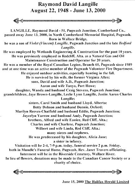 Parents Father: LANGILLE, Bedford Fulton Mother: VINCENT, Violet Evelyn Birth Born on August 22, 1948 in Wallace Bridge, Cumberland Co., NS Death Died on June 13, 2000 in Pugwash, Cumberland Co., NS Buried in Riverside Cemetery in Wallace River, Cumberland Co., NS Marriages ALLEN, Virginia M. Children LANGILLE, David LANGILLE, Aaron LANGILLE, Wanda LANGILLE, Alicia Jane Notes Occupation: Natural Gas & Oil Maintenance Construction Operator/ Employed at Wetlands Engineering & Construction Sources Halifax Herald: Obituary June 15, 2000 Images Raymond D. & Virginia (Allen) Langille Raymond D. Langille Obit