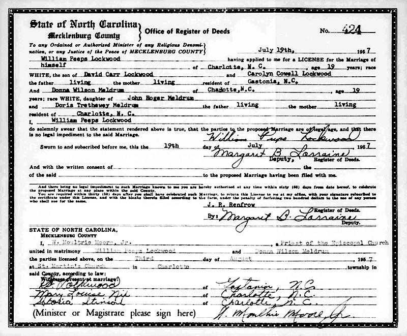 Parents Father: MELDRUM, John Roger Mother: TRETHEWEY, Doris Marie Birth Born on 1938 in Boston, Suffolk Co., MA Marriages LOCKWOOD, William Peeps Married on August 03, 1957 in Charlotte, Meckleburg Co., NC Images Donna Meldrum Marriage