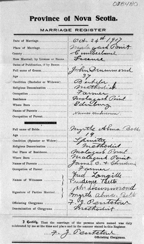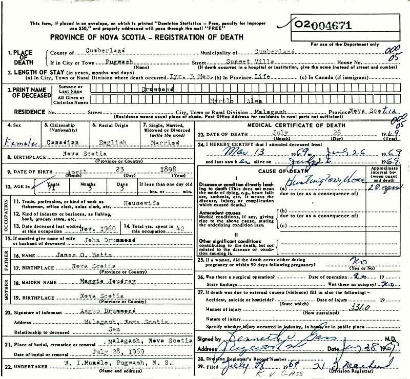 Parents Father: N/A Mother: JOUDRIE, Margaret Ellen Birth Born on April 23, 1898 in Malagash, Cumberland Co., NS Death Died on July 26, 1969 in Pugwash, Cumberland Co., NS Buried in Malagash United Church Cemetery in Malagash, Cumberland Co., NS Marriages DRUMMOND, John Married on October 24, 1917 in Malagash, Cumberland Co., NS Children DRUMMOND, Minerva May: May 12, 1918 - May 18, 1923 DRUMMOND, Orville Alman: October 27, 1920 - August 14, 1941 DRUMMOND, Angus Edison: October 31, 1922 - 1993 DRUMMOND, Muriel Margaret: December 28, 1935 - June 16, 1936 Notes Death: Huntington's Disease Sources Nova Scotia Deaths: Year 1969 #4671 Images John & Myrtle (Betts) Drummond Myrtle (Betts) Drummond Death Myrtle Betts Marriage