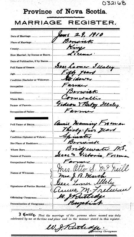 Parents Father: FREEMAN, Isaac Gorham Mother: MANNING, Lucy Victoria Birth Born on 1874 in Bridgewater, Lunenburg Co., NS Marriages BROWN, Edward Austin Married on February 22, 1922 in Clementsport, Annapolis Co., NS ILLSLEY, Isaac Loomer Married on June 29, 1910 in Berwick, Kings Co., NS Children ILLSLEY, Frances Elizabeth: July 16, 1911 - October 06, 2006 ILLSLEY, Charles Freeman: September 13, 1913 - February 14, 1923 Images Annie Freeman Marriage Annie (Freeman) Illsley Marriage