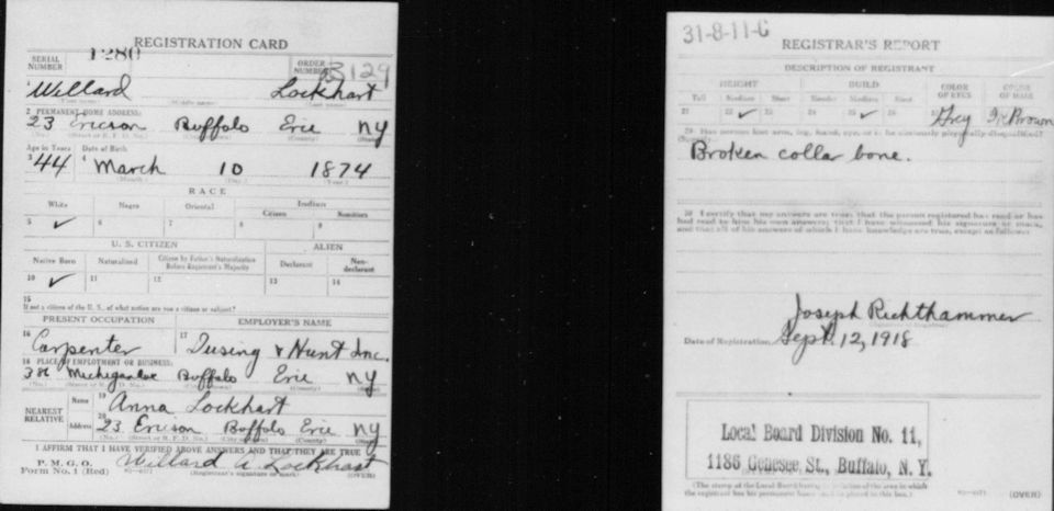 Parents Father: LOCKHART, Constant Augustus Mother: MANNING, Sarah Maria Birth Born on March 10, 1874 in Ellershouse, Hants Co., NS Death Died on August 22, 1943 in Buffalo, Erie Co., NY Buried in Mount Calvary Cemetery in Cheektowaga, Erie Co., NY Marriages BROWN, Mabel Elice Married on February 25, 1903 in Sterling, Worcester Co., MA , Anna T. Children LOCKHART, Dorothy E.: December 05, 1910 - November 17, 1979 Notes Occupation: Carpenter Sources Findagrave.com: http://www.findagrave.com/cgi-bin/fg.cgi?page=gr&GRid=118011788 Images Willard Lockhart Birth Willard Lockhart WW1 Draft