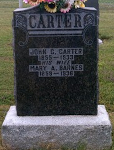 Parents Father: CARTER, William Mother: CORBETT, Rebecca Birth Born on May 15, 1857 in East Leicester, Cumberland Co., NS Death Died on October 25, 1933 in East Leicester, Cumberland Co., NS Buried in Leicester Cemetery in East Leicester, Cumberland Co., NS Marriages BARNES, Mary Ann Married on August 13, 1883 in Great Village, Colchester Co., NS Notes Occupation: Farmer Death: Senility/ Arteriosclerosis Sources Nova Scotia Deaths: Book 159 Pg. 340 Images John G. & Mary (Barnes) Carter