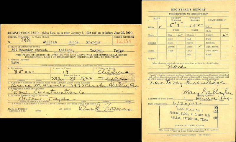 Parents Father: FRANCIS, Bruce Meador Mother: HOOPER, Ann Lucille Birth Born on May 28, 1923 in Childress, Childress Co., TX Death Died on January 05, 2000 in Corpus Christi, Nueces Co., TX Buried in Seaside Memorial Park in Corpus Christi, Nueces Co., TX Marriages WARREN, Joyce Charlene Married on November 27, 1947 in Abilene, Taylor Co., TX Children FRANCIS, Deena Ann: October 06, 1949 FRANCIS, Charles Bruce: January 28, 1952 FRANCIS, Glenn Henry: December 31, 1953 FRANCIS, Melissa Kay: December 04, 1956 Notes Occupation: Sports Writer & Columnist Corpus Christi Caller-Times Military Service: WW2 US Navy Obituary: He was a long-time sports writer and columnist for the Corpus Christi Caller-Times newspaper. He was the author of the column "Tee to Green". He began his career with the Caller-Times in July 1959 and retired in 1987. He was survived by two sons and two daughters. Corpus Christi Caller-Times Corpus Christi,Texas, January 06, 2000 Images William & Joyce (Warren) Francis William Francis WW2 Draft William Francis Marriage