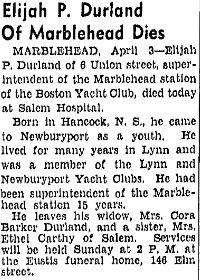 Parents Father: DURLAND, Zaccheus Mother: PHINNEY, Mary Emma Birth Born on 1871 in Phinney Mountain, Annapolis Co., NS Death Died on April 03, 1942 in Marblehead, Essex Co., MA Buried in Waterside Cemetery in Salem, Essex Co., MA Marriages BARKER, Cora Notes Occupation: Machine Operator- Shoe Factory/ Foreman - Counter Factory/ Manager - Marblehead Station of Boston Yacht Club Sources Findagrave.com: http://www.findagrave.com/cgi-bin/fg.cgi?page=gr&GRid=76574394 Images Elijah P. & Cora (Barker) Durland Elijah Durland Obit