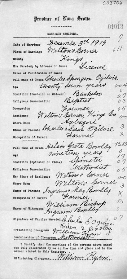 Parents Father: BOWLBY, Ingram Elverson Mother: McMILLAN, Mary Ann Birth Born on March 13, 1900 in Aylesford, Kings Co., NS Death Died on August 01, 1998 in Kings Co., NS Buried in Aylesford Union Cemetery in Aylesford, Kings Co., NS Marriages OGILVIE, Charles Spurgeon Married on December 03, 1919 in Weltons Corner, Kings Co., NS Children OGILVIE, Theodore Ingram: September 11, 1920 - August 11, 1979 OGILVIE, Harry Merrill: October 18, 1922 OGILVIE, Charles Loring: 1925 - 1980 OGILVIE, Donald Elverson: April 20, 1933 - January 07, 2024 Sources Kings Cemetery Records: Aylesford Union Cemetery Images Helen Bowlby Birth Charles & Helen (Bowlby) Ogilvie Helen Bowlby Marriage