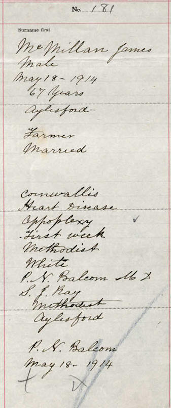 Birth Born on March 19, 1847 in Fairville, Kings Co., NS Death Died on May 18, 1914 in Aylesford, Kings Co., NS Buried in Aylesford United Cemetery in Aylesford, Kings Co., NS Marriages BROUGHAM, Mary Jane Married on October 23, 1872 in Berwick, Kings Co., NS Children McMILLAN, Mary Ann: April 29, 1876 - October 23, 1970 Notes Occupation: Farmer Death: Heart Disease/ Apoplexy Sources Nova Scotia Deaths: Book 40 Pg. 49 #181 Images James & Mary (Brougham) MacMillan James MacMillan Death James MacMillan Marriage