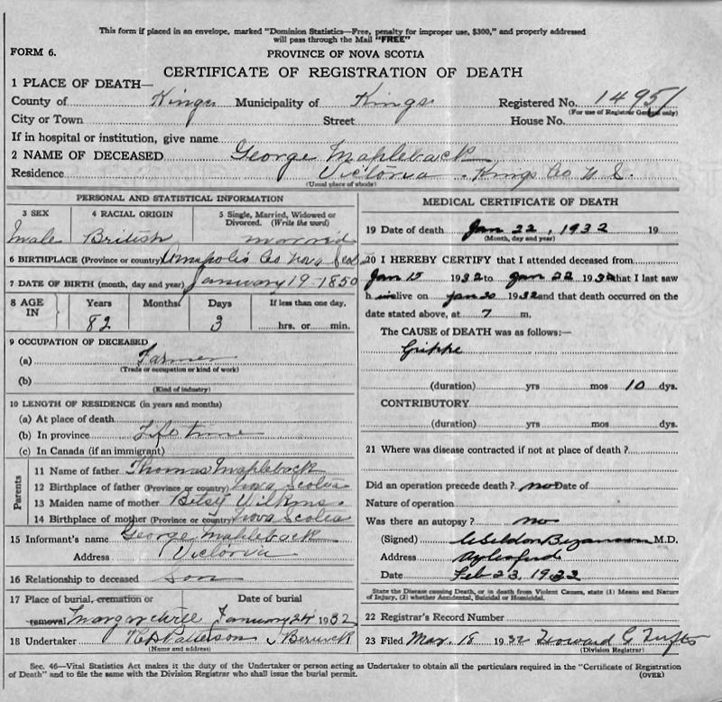 Birth Born on January 19, 1850 in Margaretsville, Annapolis Co., NS Death Died on January 22, 1932 in Victoria, Kings Co., NS Buried in Margaretsville Cemetery in Margaretsville, Annapolis Co., NS Marriages McKINLEY, Frances Married on January 27, 1876 in Aylesford, Kings Co., NS Children MAPPLEBECK, Anne L.: December 26, 1877 - July 08, 1901 MAPPLEBECK, Bessie Lavinia: March 31, 1879 - March 19, 1902 Notes Occupation: Farmer Death: Grippe Sources Nova Scotia Deaths: Book 126 Pg. 1495 Images George Mapplebeck Death George Mapplebeck Marriage