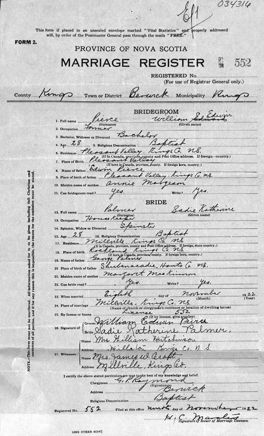 Parents Father: PIERCE, Edwin Parker Mother: MARGESON, Anne Birth Born on May 15, 1894 in Pleasant Valley, Kings Co., NS Death Died on 1969 in Grafton, Grafton Co., NH Buried in Valley Cemetery in Lebanon, Grafton Co., NH Marriages PALMER, Sadie Katherine Married on November 08, 1922 in Millville, Kings Co., NS Notes Occupation: Farmer/ Machinist Images William Pierce Birth Affidavit William Pierce Birth William Pierce Sadie Palmer Marriage William Pierce Naturalization