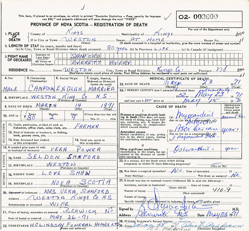 Parents Father: SANFORD, Seldon Vicars Mother: SHAW, Love Minetta Birth Born on March 14, 1891 in Weston, Kings Co., NS Death Died on May 23, 1971 in Weston, Kings Co., NS Buried in Berwick Cemetery in Berwick, Kings Co., NS Marriages POWER, Vera Muriel Married on June 14, 1916 in Kingston, Kings Co., NS Children SANFORD, Marion Elizabeth: August 04, 1922 - March 01, 2014 SANFORD, Audrey Marguerite: October 14, 1926 - December 04, 2015 Notes Occupation: Farmer Death: Myocardial Infarction Sources Nova Scotia Deaths: Year 1971 #3600 Images Everett Sanford Death Everett Power Marriage