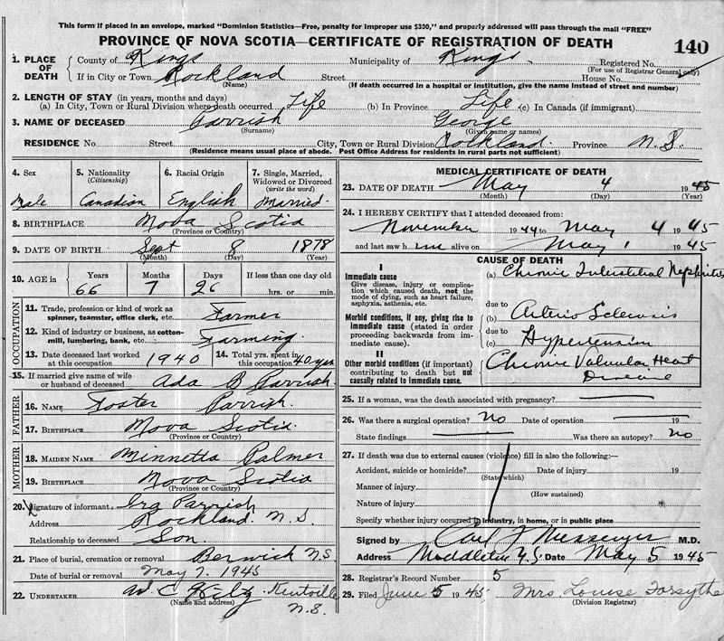 Parents Father: PARRISH, Foster Benjamin Mother: PALMER, Minetta L. Birth Born on September 08, 1878 in Rockland, Kings Co., NS Death Died on May 04, 1945 in Rockland, Kings Co., NS Buried in Berwick Cemetery in Berwick, Kings Co., NS Marriages BEST, Ada Beatrice Married on December 23, 1903 in Waterville, Kings Co., NS Children PARRISH, Ray Donald: August 03, 1906 - November 18, 1911 PARRISH, Harold Ira: February 04, 1910 - March 06, 1999 Notes Occupation: Farmer Death: Chronic Intestinal Nephritis Sources Nova Scotia Deaths: Book 223 Pg. 140 Images George & Ada (Best) Parrish George Parrish Death George Parriah Marriage Ada Best Marriage