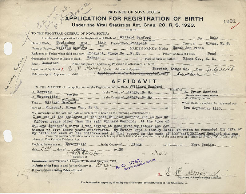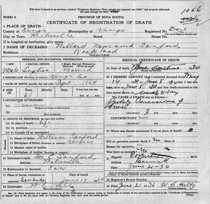Parents Father: SANFORD, William Henry Mother: PINEO, Sarah Ann Birth Born on September 03, 1867 in Prospect, Kings Co., NS Death Died on June 14, 1934 in Waterville, Kings Co., NS Buried in Cambridge Cemetery in Cambridge, Kings Co., NS Marriages PARRISH, Margaret Olivia Married on March 20, 1889 in Prospect, Kings Co., NS Children SANFORD, Ethel Blanche: March 03, 1890 - May 01, 1929 SANFORD, Mattie Boyce: January 29, 1893 - May 05, 1961 SANFORD, Murray Emerson: August 01, 1896 - 1982 SANFORD, Minetta Marguerite: April 25, 1898 - December 15, 1971 SANFORD, Cecil Budd: 1904 - September 23, 1988 SANFORD, Viola Martha: March 02, 1914 - 2003 Notes Occupation: Farmer Death: Carcinoma of Bowel Sources Nova Scotia Deaths: Book 148 Pg. 1056 Images Willard Sanford Birth Willard & Margaret (Parrish) Sanford Willard Sanford Death Margaret Parrish Marriage