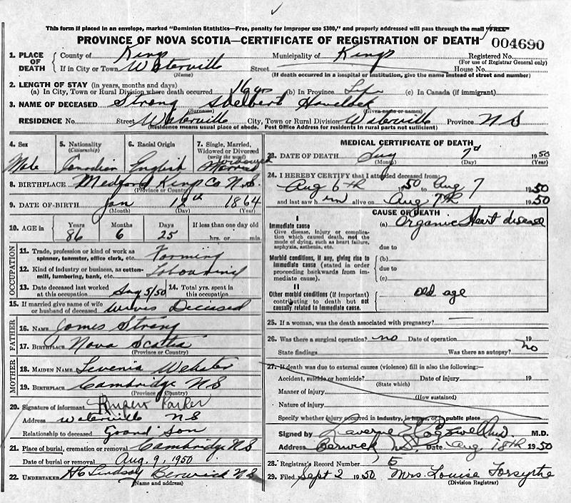 Parents Father: STRONG, James Manning Mother: WEBSTER, Lavinia Birth Born on January 12, 1864 in Medford, Kings Co., NS Death Died on August 07, 1950 in Waterville, Kings Co., NS Buried in Cambridge United Baptist Cemetery in Cambridge Station, Kings Co., NS Marriages PARRISH, Effie Elizabeth Married on February 10, 1892 in Grafton, Kings Co., NS Children STRONG, Alma Vera: 1893 - May 20, 1894 STRONG, Manning Foster: March 29, 1895 - September 05, 1952 STRONG, Frank Carroll: January 17, 1897 - June 09, 1973 STRONG, Wilfred Renfrew: January 07, 1899 - 1979 STRONG, Paul Irving: December 07, 1900 - 1979 STRONG, Everett Sydney: 1903 - 1980 STRONG, Viola: April 30, 1904 - March 04, 1904 STRONG, Clara Christine: October 03, 1908 - November 06, 1964 STRONG, Merritt Menzo: February 26, 1912 - December 06, 1958 Notes Occupation: Farmer Death: Organic Heart Disease Sources Nova Scotia Deaths: Book 1950 Pg. 4690 Images Adelbert & Effie (Parrish) Strong Adelbert Strong Death Effie Parrish Marriage