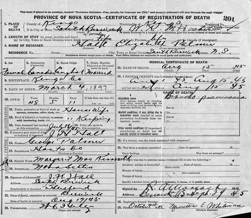 Parents Father: PALMER, George Mother: McKINNON, Margaret Birth Born on March 04, 1897 in Rockland, Kings Co., NS Death Died on August 15, 1945 in Berwick, Kings Co., NS Buried in Berwick Cemetery in Berwick, Kings Co., NS Marriages HALL, John Henry Married on April 19, 1921 in Millville, Kings Co., NS Children HALL, Maxwell Palmer: September 16, 1921 - April 05, 1943 HALL, Frank Lorimer: July 07, 1930 - September 02, 2023 HALL, Donald MacKinnon: October 22, 1931 - July 16, 2015 Notes Death: Bronchopneumonia Sources Nova Scotia Deaths: Year 1945 File 223 #201 Images John & Elizabeth (Palmer) & Maxwell Hall Elizaberth (Palmer) Hall Death