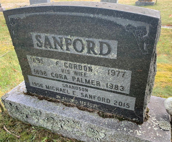 Parents Father: PALMER, Robert Bordman Mother: RAINFORTH, Ermina Anna Birth Born on August 09, 1898 in Windermere, Kings Co., NS Death Died on February 12, 1983 in Berwick, Kings Co., NS Buried in Berwick Cemetery in Berwick, Kings Co., NS Marriages SANFORD, Frederick Gordon Married on April 21, 1915 in Somerset, Kings Co., NS Children SANFORD, Dorothy Bernice: December 31, 1916 - September 22, 1996 SANFORD, Robert Ivan: March 16, 1920 - January 19, 1999 SANFORD, Frederick Gordon: August 03, 1921 - January 28, 1996 Images Frederick & Cora (Palmer) & Michael Sanford Cora Palmer Marriage Frederick & Cora (Palmer) Sanford