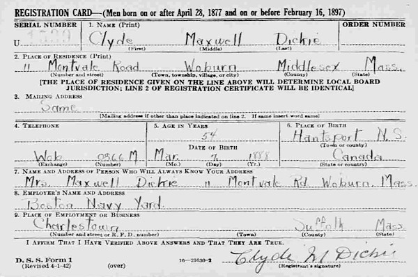 Parents Father: DICKIE, Thomas Baxter Haley Mother: WILLIGAR, Ellen Priscilla Birth Born on March 07, 1888 in Hantsport, Hants Co., NS Death Died on 1969 in Woburn, Middlesex Co., MA Buried in Puritan Lawn Memorial Park in Peabody, Essex Co., MA Marriages HENDERSON, Bertha Maud Married on November 29, 1909 in Providence, Providence Co., RI LANGILLE, Pearl Ella Children DICKIE, Dorothy Mildred: October 26, 1910 DICKIE, Ida Geraldine: January 30, 1918 DICKIE, Boy: July 15, 1920 - July 15, 1920 DICKIE, Clyde E.: July 17, 1930 - October 10, 2012 DICKIE, Marjorie E.: June 07, 1933 Notes Occupation: Sheet Metal Worker/ Boston Naval Shipyard Worker Sources Massachusetts Cemeteries: Puritan Lawn Memorial Park Peabody,MA Section M, Lot 229, Grave 1 Images Clyde M. Dickie WW2 Draft Clyde Dickie Marriage Clyde & Pearl Dickie Clyde Dickie WW2 Draft