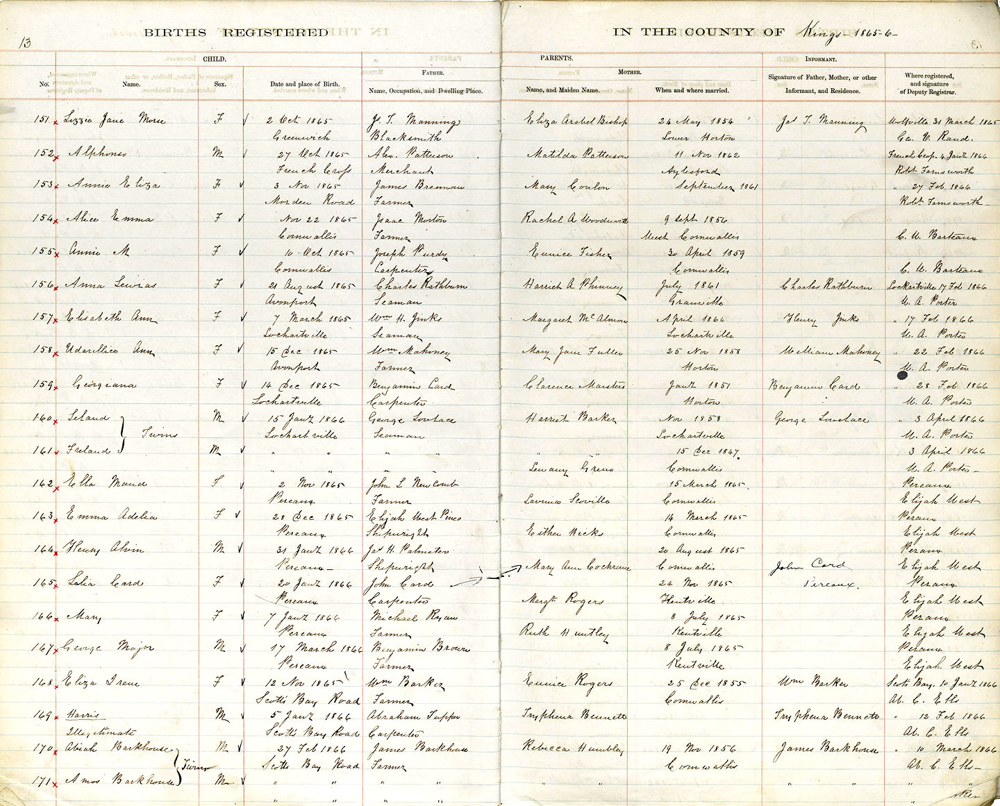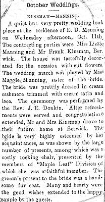 Parents Father: MANNING, James Thomas Mother: BISHOP, Eliza Arabella Birth Born on October 02, 1865 in Greenwich, Kings Co., NS Death Died on October 19, 1937 in Halifax, Halifax Regional Municipality, NS Buried in Berwick Cemetery in Berwick, Kings Co., NS Marriages KINSMAN, Frank Andrew Married on October 11, 1899 in Greenwich, Kings Co., NS Children KINSMAN, Hazel Frances: May 29, 1901 - May 01, 1994 KINSMAN, Margaret Elizabeth: February 09, 1905 - October 07, 1999 Sources Nova Scotia Deaths: Book 169 Pg. 710 Images Lizzie Manning Birth Lizzie (Manning) Kinsman Death Lizzie Manning Marriage Lizzie Manning Wedding